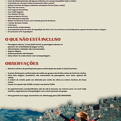 Olá Viajante!!! Embarque na aventura dos seus sonhos com a Vive Tour Dreams! 🚀 Junte-se a nós em uma emocionante excursão para Cusco e Machu Picchu, onde tudo está incluso! 🏞️ Deixe suas preocupações para trás, pois cuidaremos de tudo, desde os ingressos até os voos e hospedagem, com refeições deliciosas ao longo do caminho. 🍽️ Não perca essa oportunidade única de explorar esses destinos incríveis sem estresse. Reserve agora e prepare-se para uma jornada inesquecível! O objetivo da Vive Tour Sueños é fazer o máximo possível para tornar sua viagem inesquecível! Nossos clientes pouco antes da viagem receberão livretos com dicas e orientações para conhecer melhor o seu destino. Cada um receberá um kit viagem especial. Arrume as malas e embarque conosco. Peru e a Vive TOUR Sueños lhe esperam de braços abertos. Bora?